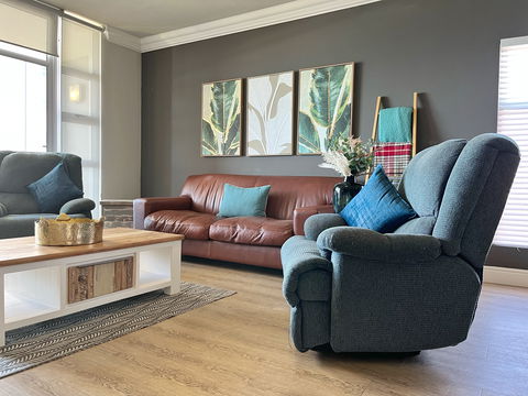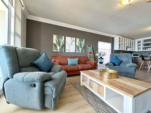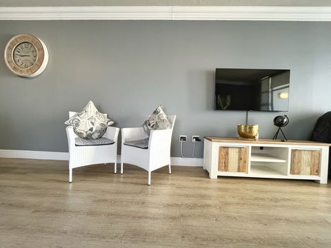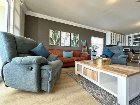 Open-plan lounge with flat-panel TV, DSTV, and free Wi-Fi: Whether you're cooking a family feast, enjoying morning coffee, or winding down after a day in the sun, this living space is made for connection and comfort.