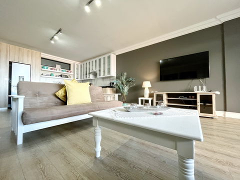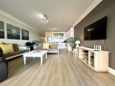 Spacious Lounge & Dining Area: The modern open-plan lounge is perfect for unwinding after a beach day. Relax with a movie, enjoy time together, or step out and take in the sea breeze.