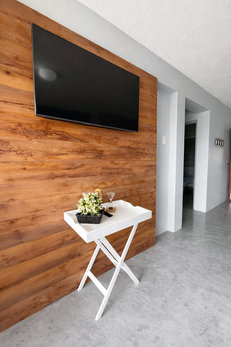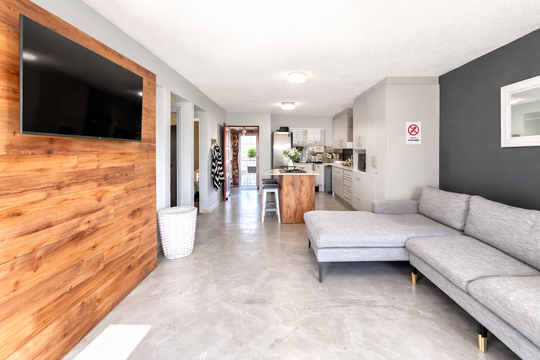 Lounge: Comfortable Coricraft L-shaped sofa and Flat-Panel Smart TV with access to Netflix, Disney+, Showmax, and Prime Video. Guests can also log into their own DStv profile.